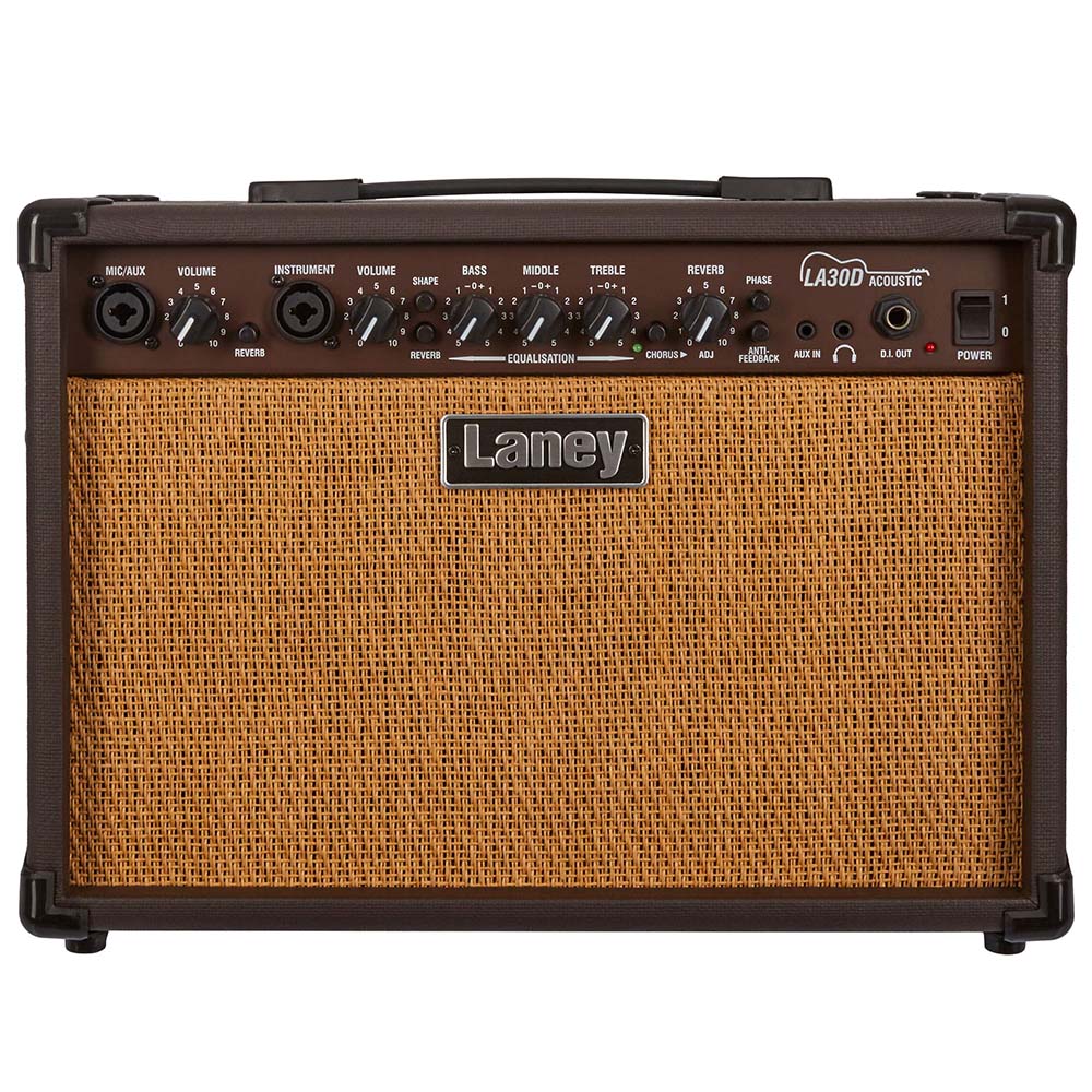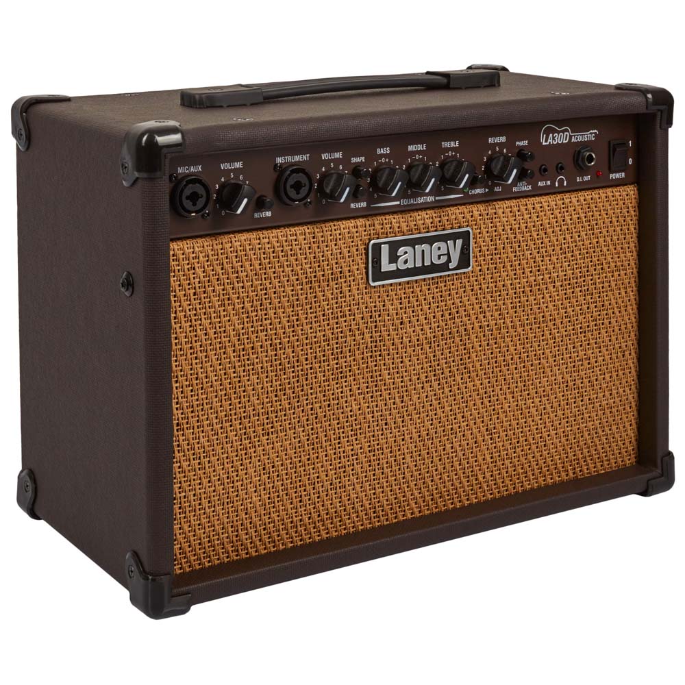 Laney LA30D – комбоусилитель для электроакустической гитары мощностью до 30 Ватт, двумя 8-дюймовыми сабвуферами, трехполосным эквалайзером, встроенными эффектами реверберации, хорусом, фазой, и подключением микрофона.