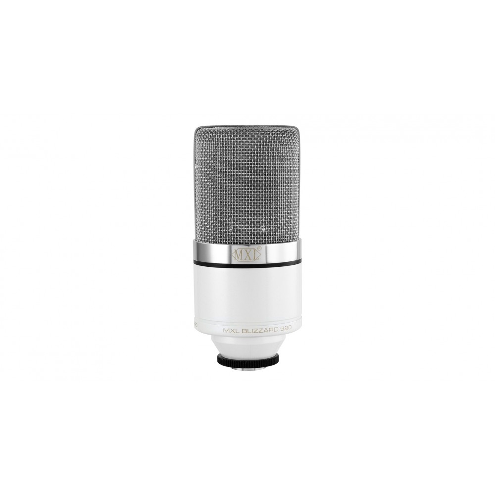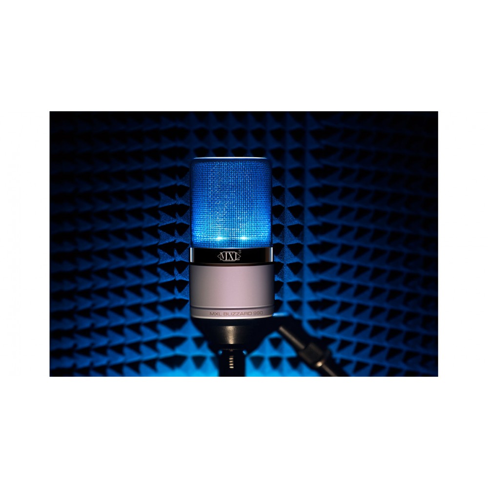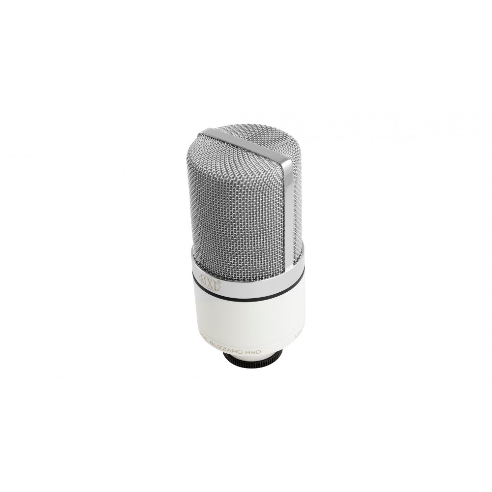 MXL 990 Blizzard — конденсаторный микрофон с предусилителем с балансным выходом, кардиоидной направленностью и четырьмя светящимися синими светодиодными индикаторами за решеткой микрофона.