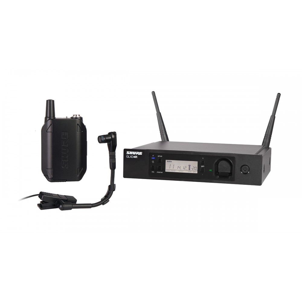 Shure GLXD14RE/B98 – цифровая инструментальная радиосистема для духовых инструментов, состоящая из рэкового приемника GLXD4R, поясного передатчика GLXD1 и микрофона B98H/C, работающая в диапазоне 2.4 ГГц.