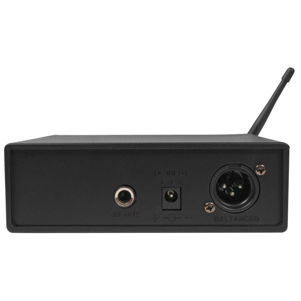 Компактный приемник, также изготовленный из прочного пластика, имеет кнопку включения, регулятор уровня сигнала и светодиодные индикаторы, которые информируют о наличии входного сигнала, подаче питания и синхронизации с передатчиком. На задней панели находятся балансный выход с разъемом XLR и выход AF Out с разъемом jack TS 1/4".
