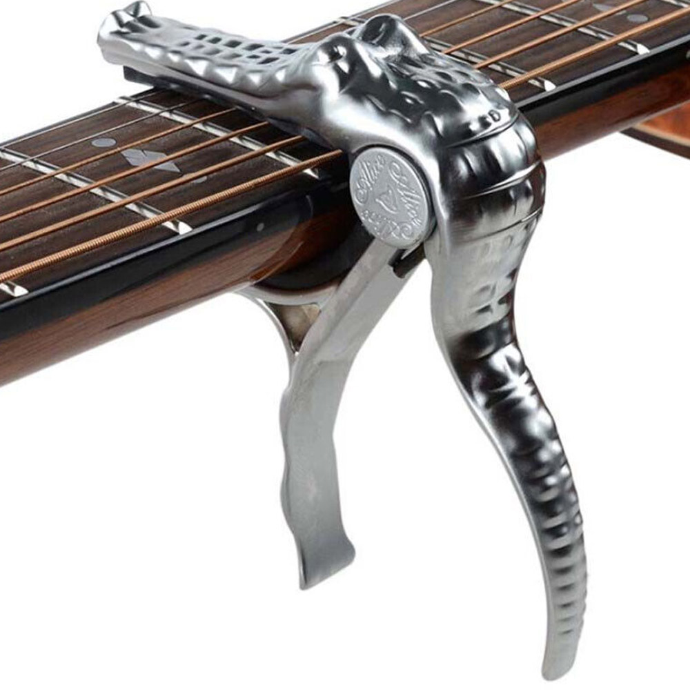 A007G/PC от Alice имеет уникальную форму крокодила и изготовлен из алюминиевого сплава. Высококачественная стальная пружина рассчитана для постоянного давления, благодаря чему каподастр надежно держится на грифе гитары и удобно перемещается или снимается с грифа, обеспечивая достаточное давление на струны, без пережимов, недожимов, и, соответственно, сохраняет стабильный строй. Изготовлен из легкого алюминиевого сплава. Каподастры отлично подходят, если вы хотите научиться играть свои любимые песни на гитаре, но необходимо высокое звучание инструмента под голос.