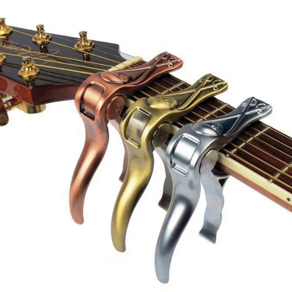 С каподастром и несколькими основными аккордами вы можете играть практически в любой тональности. Каподастр укорачивает длину всех струн одновременно, заменяя, по сути, собой верхний порожек. Все «открытые» струны с ним звучат выше, чем без каподастра. Изготовлен из легкого алюминиевого сплава.