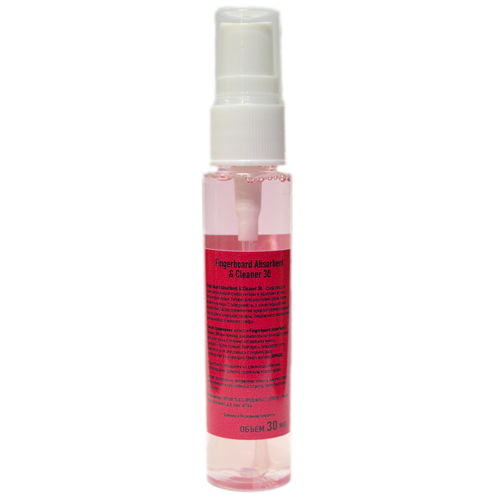 Fingerboard Absorbent & Cleaner 30 от Armadil представляет собой спрей-очиститель грифа гитары, может использоваться в качестве первого шага при обработке и уходу за грифом. Подходит для большинства пород дерева, не рекомендуется для использования на кленовые накладки, так как они зачастую обладают лакированным покрытием, для которого вредны любые очистители. Абсорбирующие свойства данного клинера не только очищают поверхность грифа инструмента от пота, жировых выделений и въевшихся загрязнений, но и извлекают излишнюю влагу из пор древесины, которая могла остаться, например, при предыдущей очистке и обработке.