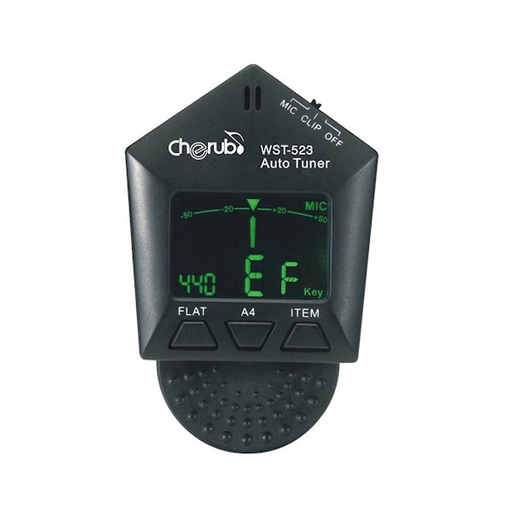 Тюнер WST-523 от Cherub может работать в нескольких режимах: Clip и Mic. Режим Clip позволяет тюнеру снимать вибрации инструмента, а режим MIC — производить отстройку через звуковой сигнал, отправленный на встроенный микрофон. ЖК-дисплей отображает состояние настройки инструмента и имеет три цвета: красный, оранжевый, зеленый. Тюнер имеет крепление "прищепку", чтобы его можно было быстро прикрепить на голову гитары. Тюнер Cherub WST-523 можно использовать для настройки гитар, укулеле, духовых и скрипичных инструментов.
