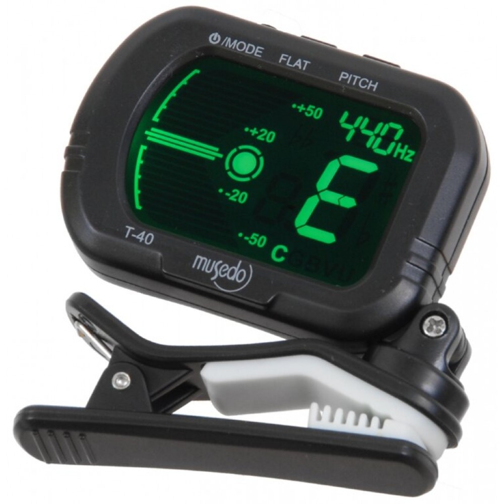 Тюнер T-40 от Musedo — компактный тюнер типа прищепка для струнных музыкальных инструментов, в частности, гитары. Тюнер T-40 на — это новое поколение компактных, точных и простых в использовании тюнеров от Musedo, имеет несколько режимов для нескольких инструментов: с помощью него можно настроить акустическую, электрогитару, бас-гитару, скрипку, укулеле. Дисплей можно поворачивать практически под любым углом или положением для удобства просмотра во время настройки.