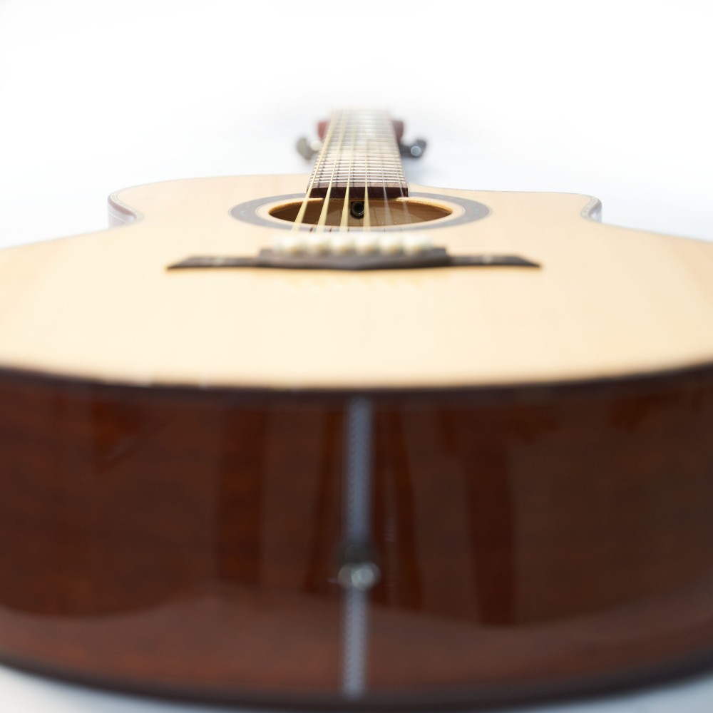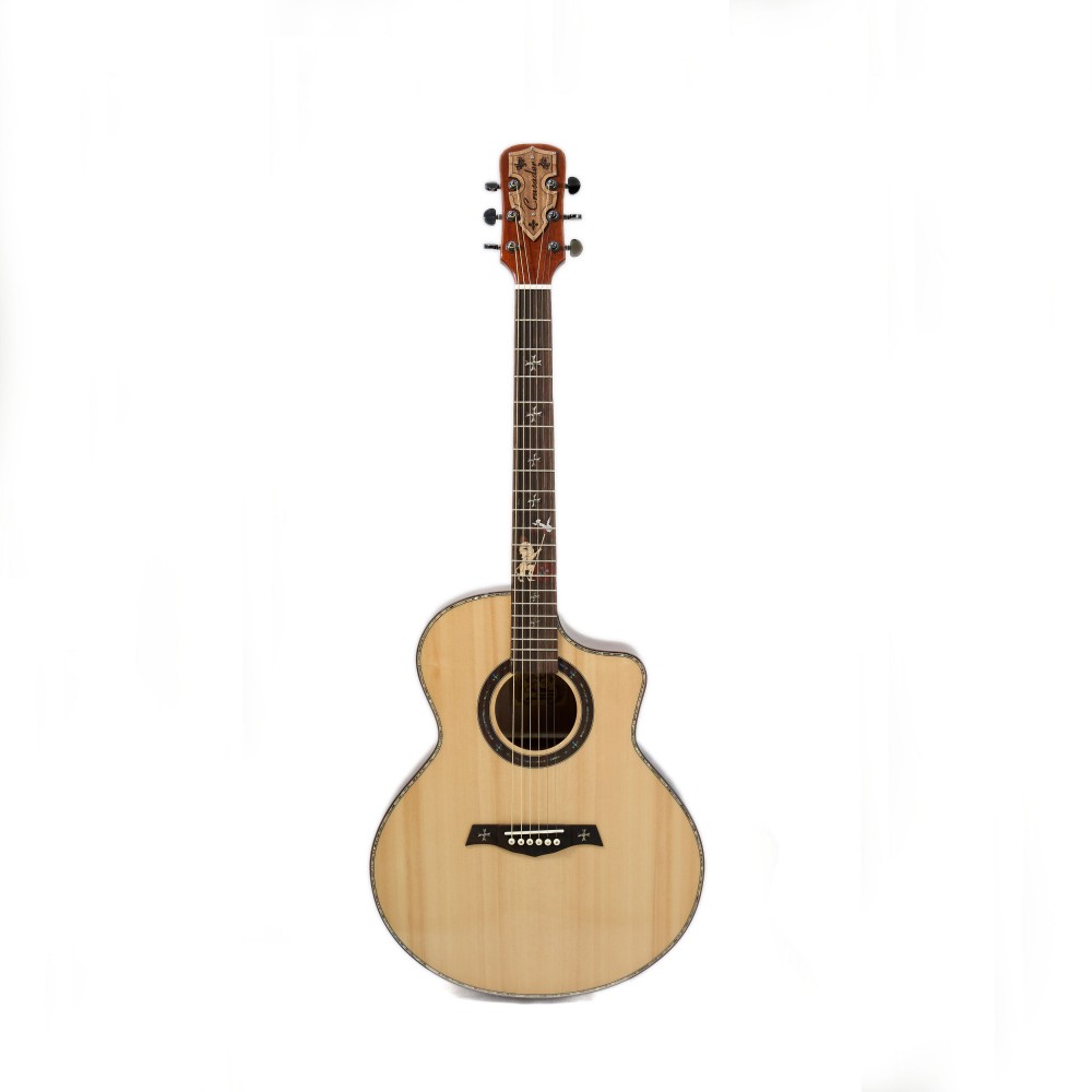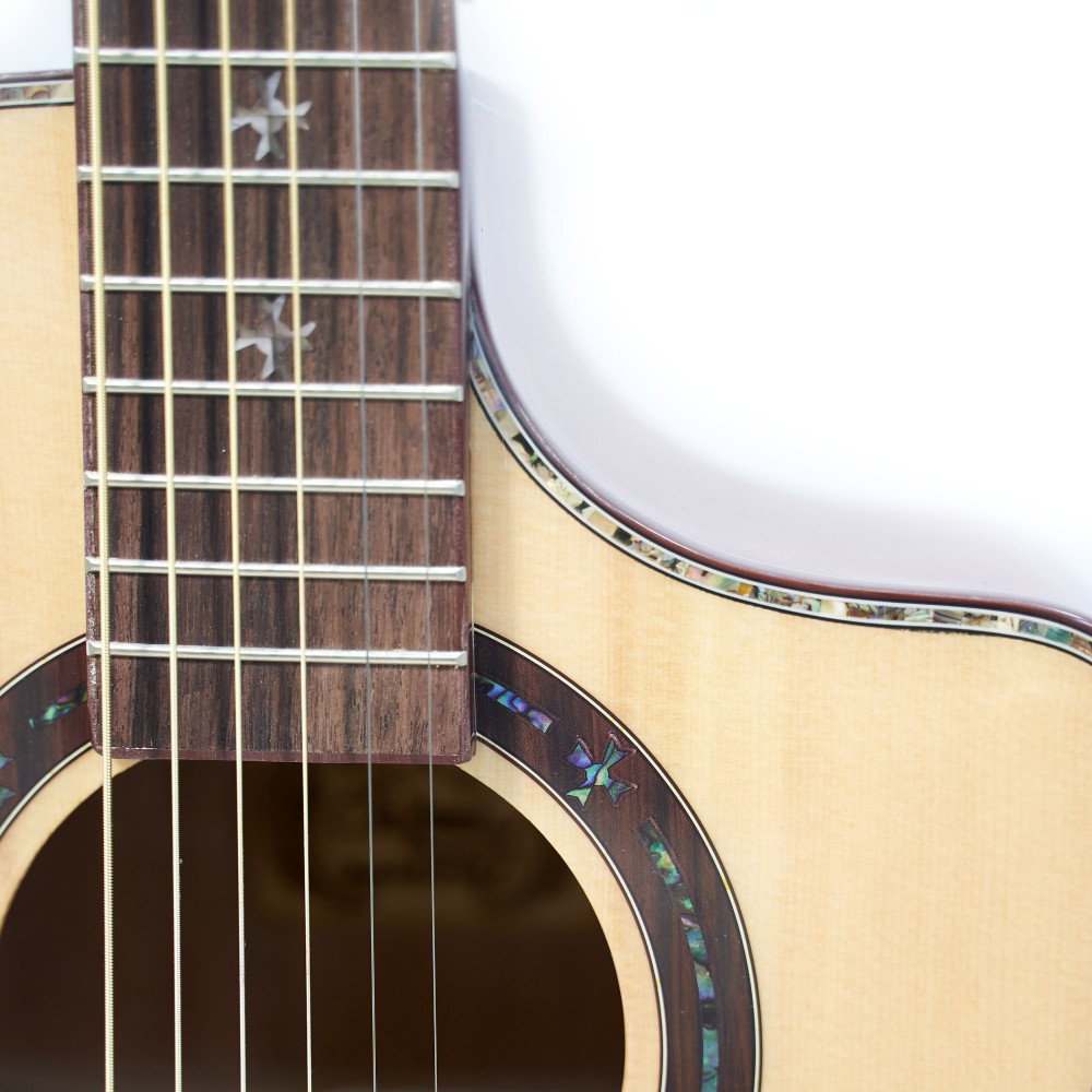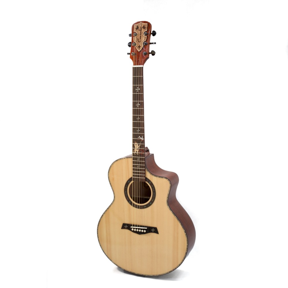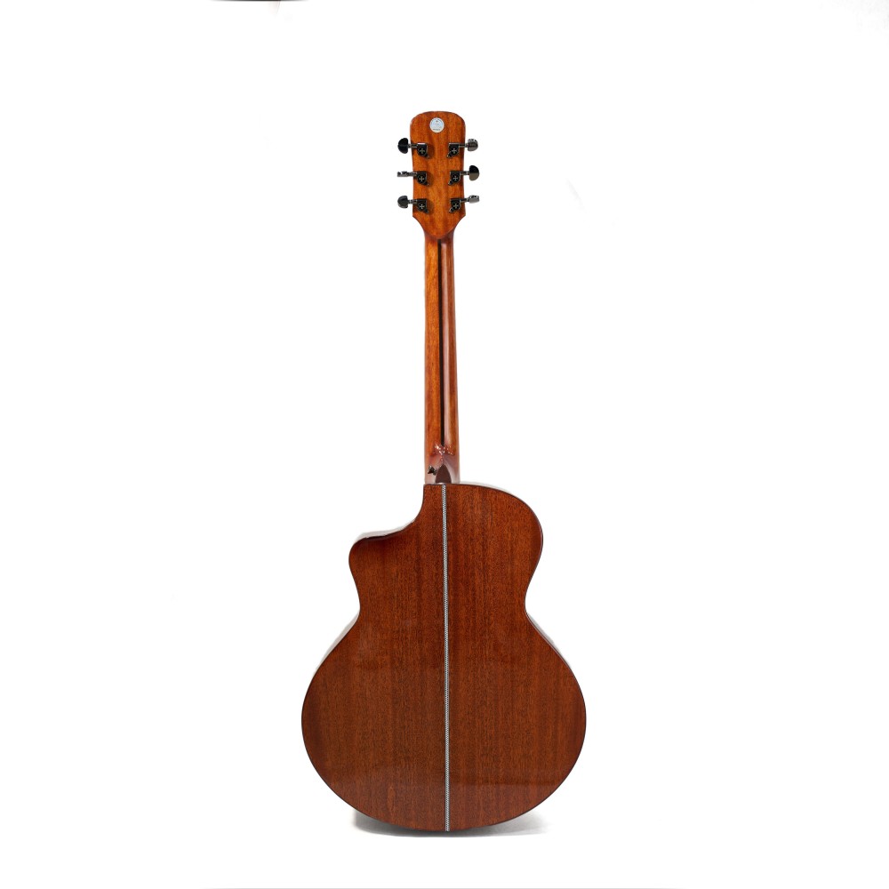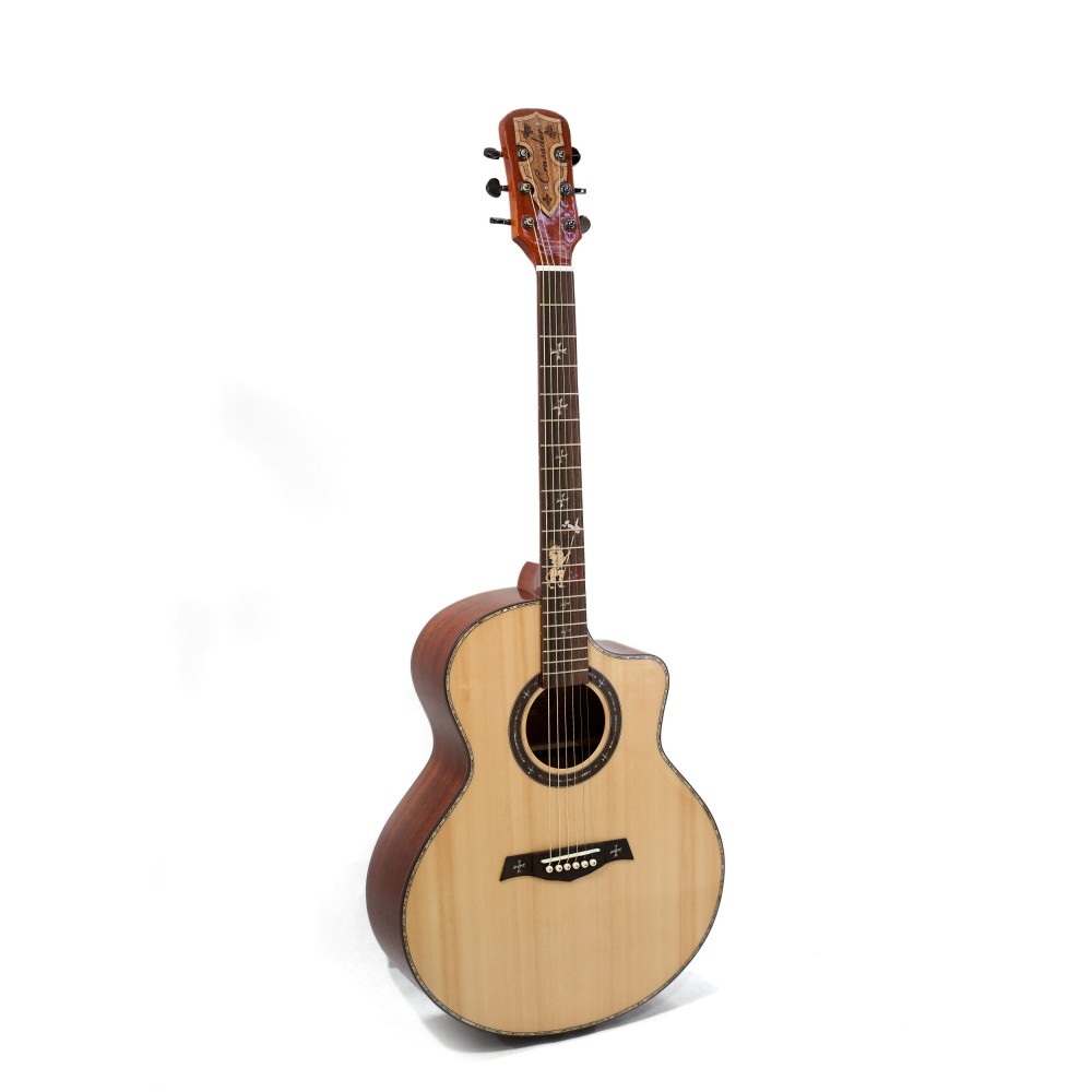 Корпус формата jumbo (41”) обеспечивает насыщенный низ и выразительный резонанс, а вырез cut-away позволяет с лёгкостью достигать верхних ладов. Глянцевая отделка подчёркивает естественную красоту древесины и делает гитару эффектной на сцене.
