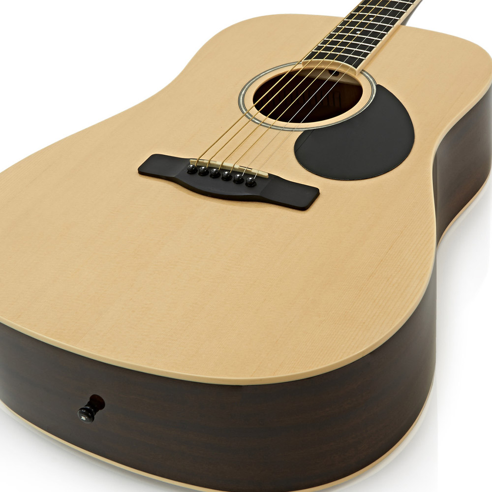 Акустическая гитара D-2 от Greg Bennett выполнена в форме дредноут, обладающей глубоким звуком. Корпус имеет приятный внешний вид, с обеих сторон имеет окантовку, розетка отделана инкрустацией.