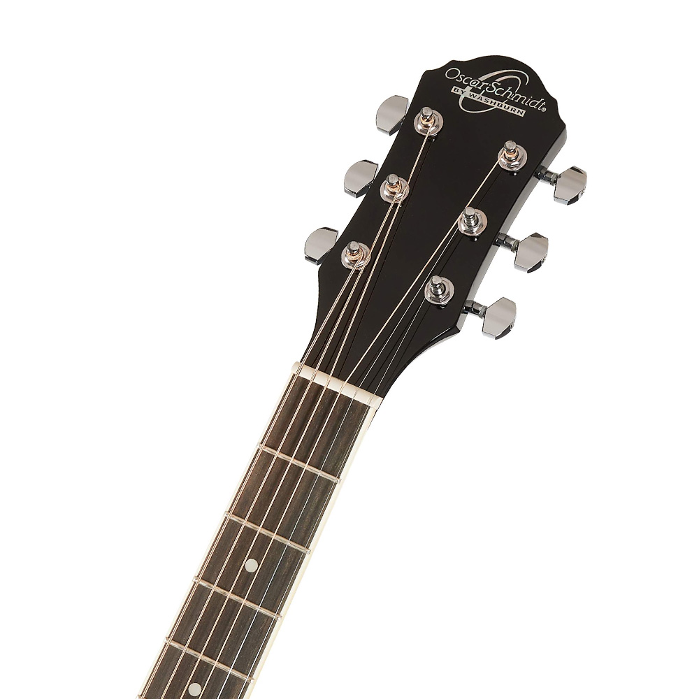 Oscar Schmidt OG2B – акустическая гитара с корпусом типа дредноут, верхней декой из ели, нижней декой и обечайкой из красного дерева махагони, с мензурой 25,6”.