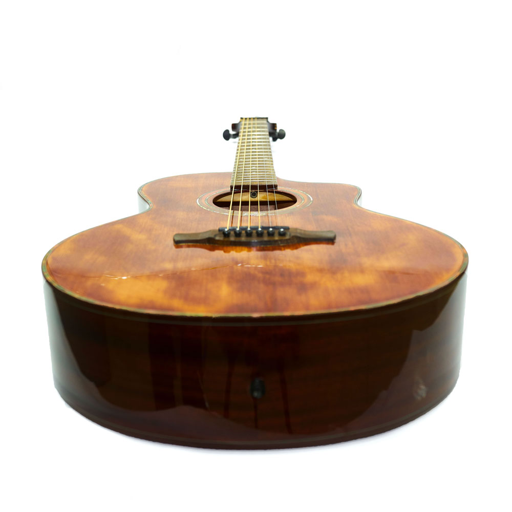Джамбо- один из популярных видов гитар. Корпус не лишен изящества - линии округлы, обе деки плоские. Имеется вырез для лучшего доступа к верхним ладам. Верхняя дека гитары LJF-50C изготовлена из ели. Нижняя дека и обечайки изготовлены из махагони.