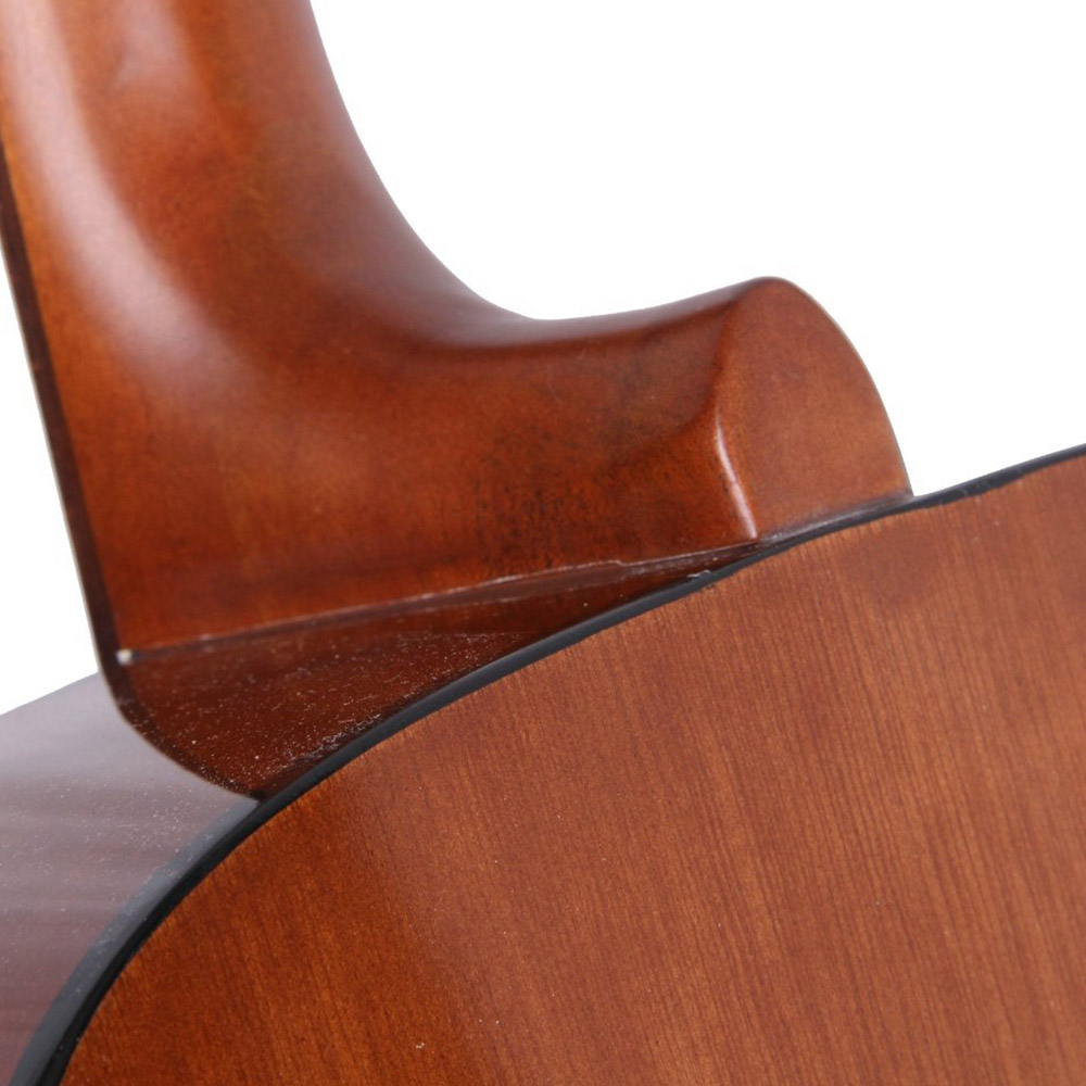 Верхняя дека гитары изготовлена из ламинированной ели, корпус из породы красного дерева – меранти.