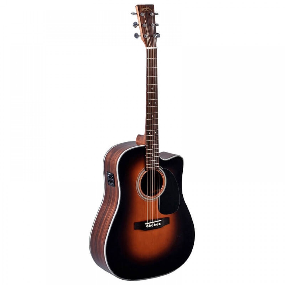 Sigma DRC-1STE-SB – электроакустическая гитара с корпусом типа дредноут cut-away, верхней декой из массива ели, нижней декой и обечайкой из палисандра, двухполосным эквалайзером, встроенным тюнером, с мензурой 25,5”.