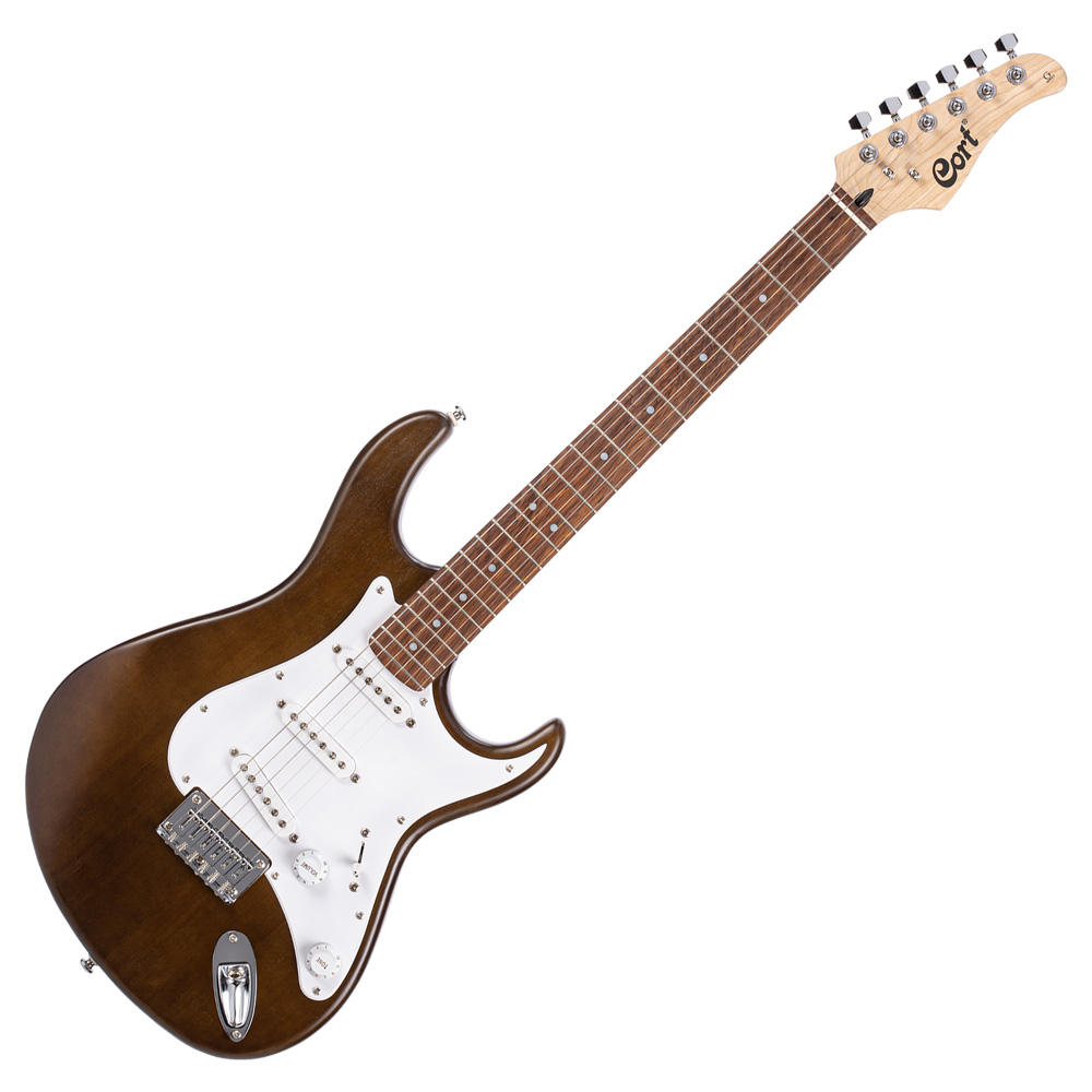 Cort G100 – эта модель серии электрогитар “G” с фиксированным мостом и классическим вариантом датчиков S-S-S. Серия гитар Cort “G” это логическое продолжение винтажных моделей. Современные модели, которые сохраняют знакомые черты классического дизайна с двойным вырезом. Гитара Cort G100 имеет двойной вырез который характерен для модели стратокастера, это обеспечивает комфорт и лёгкий доступ к высоким позициям музыканту. Cort G100 имеет три сингловых датчика Powersound, это гитара удачно подходит для таких музыкальных направлений, как: рок, блюз, поп и кантри. Гитара имеет 5-ти позиционный и 2-ной регулятор тона что позволяет увеличить звуковой диапазон инструмента. Толщина корпуса всего 39 мм. Благодаря тонкому корпусу всего 39 мм существенно уменьшен вес инструмента и обеспечивает идеальный баланс грифа и корпуса, что в свою очередь снижает утомляемость и повышает играбельность инструмента. Фиксированный мост позволяет добиться стабильности в настройке гитары, а также позволяет достичь сфокусированного звучания. Гитара имеет специальное покрытие, которое позволяет улучшить резонансные качества дерева и сделать звук живее. Скошенная пятка грифа. В отличие от прямоугольных пяток на болтах, которые типичны для большинства гитар, в модели G100 применена скошенная пятка, что существенным образом облегчает игру в верхних позициях.