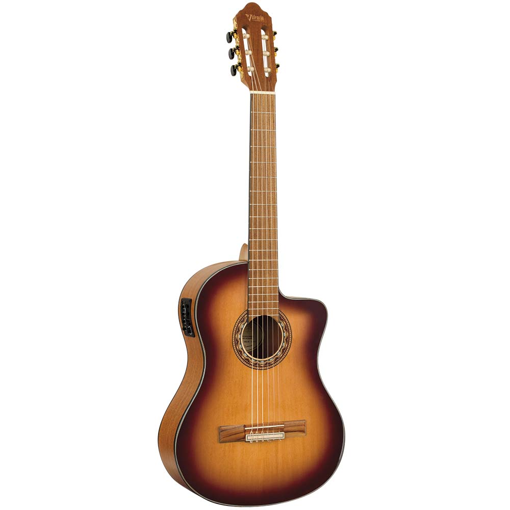 Valencia VC-314CE ASB - электроклассическая гитара с верхней декой из ламинированной ели, нижней декой и обечайкой из красного дерева, размером 4/4, мензурой 650 мм (25 5/8”), с 3-полосным эквалайзером и со встроенным хроматическим тюнером.