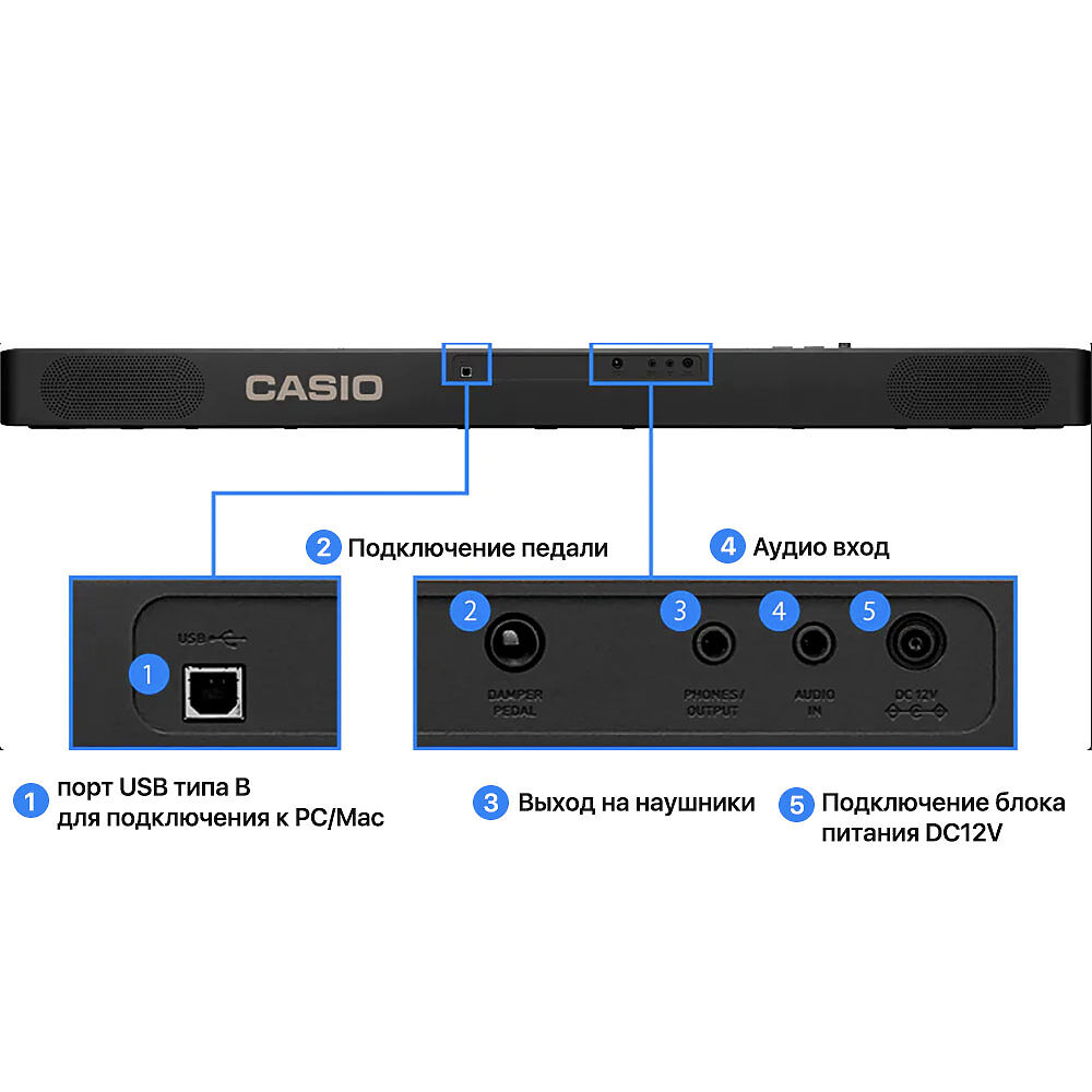 USB-порт (тип B) позволяет подключать инструмент к компьютеру для работы с программами и записи. Поддерживается использование демпферной педали для расширенного контроля над звуком.