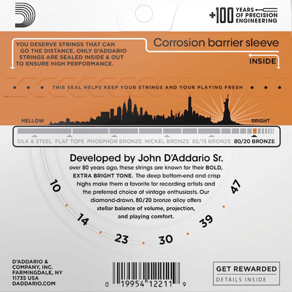 Оформить заказD'Addario EJ10 - струны для акустической гитары калибром 10-47, с обмоткой из бронзы 80/20, натяжением Extra Light.