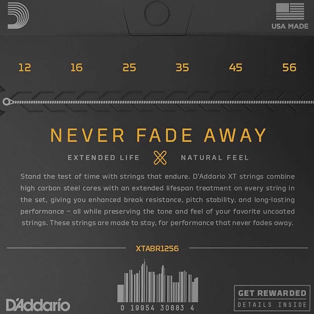 Струны без обмотки в комплектах серии XT выполнены по технологии «Fusion Twist», устойчивые к расстройке и разрыву. Набор D'Addario XTABR1256 12-56 имеет натяжение Light Top/Medium Buttom, на нем легко играть начинающим и любителям, а также проще делать некоторые элементы, например, бэнды.