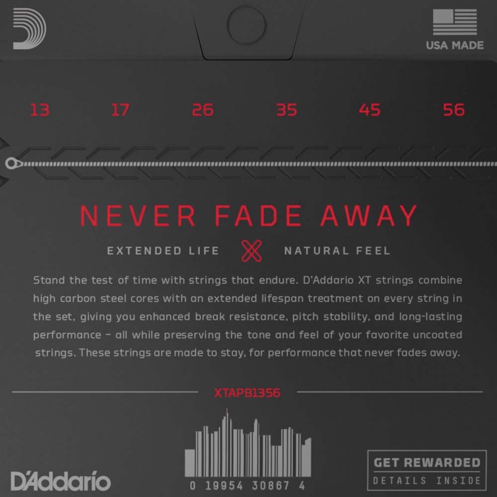 Струны без обмотки в комплектах серии XT выполнены по технологии «Fusion Twist», устойчивые к расстройке и разрыву. Набор D'Addario XTABR1356 13-56 имеет натяжение Medium, на нем легко играть начинающим и любителям, а также проще делать некоторые элементы, например, бэнды.