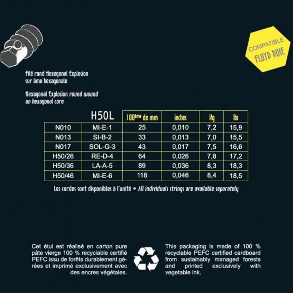 Комплект струн для электрогитары H50L от Savarez относятся к серии Hexagonal Explosion, обмотка выполнена из никелированной стали, шестигранный сердечник. Струны Savarez H50L подходят для всех стандартных бриджей, а также оптимально спроектированы для использования с тремоло типа Floyd Rose. Струны обеспечивают оптимальную производительность, отличный тон и большую долговечность. Эти струны обеспечивают четкие высокие частоты, яркую, мощную середину и сфокусированные низкие частоты для динамичной игры соло или аккомпанемента, обладают отличной передачей как на чистом, так и на сильно перегруженном звуке.