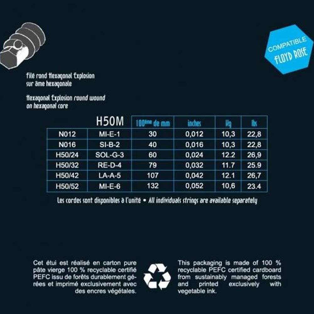 Комплект струн для электрогитары H50M от Savarez относятся к серии Hexagonal Explosion, обмотка выполнена из никелированной стали, шестигранный сердечник. Струны Savarez H50B подходят для всех стандартных бриджей, а также оптимально спроектированы для использования с тремоло типа Floyd Rose. Струны обеспечивают оптимальную производительность, отличный тон и большую долговечность. Эти струны обеспечивают четкие высокие частоты, яркую, мощную середину и сфокусированные низкие частоты для динамичной игры соло или аккомпанемента, обладают отличной передачей как на чистом, так и на сильно перегруженном звуке.
