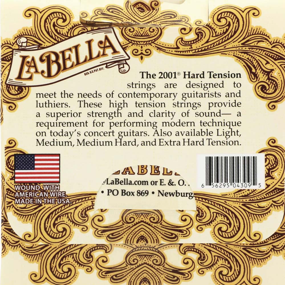 Струны серии La Bella 2001, предлагаемые в различных вариантах натяжения для исполнителей классической музыки и фламенко, обеспечивают исключительное интонированное высоты звука и стабильное звучание. Три первые струны выполнены из нейлона, обеспечивают превосходную чувствительность к прикосновению. La Bella 2001H High Tension отзывчивы и чувствительны к малейшему вибрато левой руки и тонким тональным изменениям, производимым правой рукой. Они сочетают в себе высокую производительность и потрясающую простоту игры.